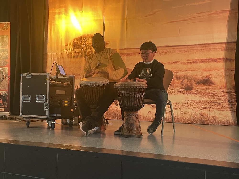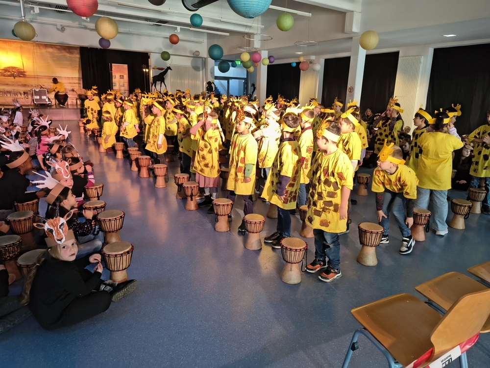 Eine ganz besondere Projektwoche findet alle 4 Jahre statt. Dann kommt das Team vom Trommelzauber in unsere Schule. Die Kinder lernen viel über Afrika, aber vor allem wird intensiv getrommelt! Die Kinder der Jahrgänge üben die Tänze der Gazellen, Elefanten, Giraffen und Affen und lassen sich vom Rhythmus der Trommeln in eine andere Welt entführen.